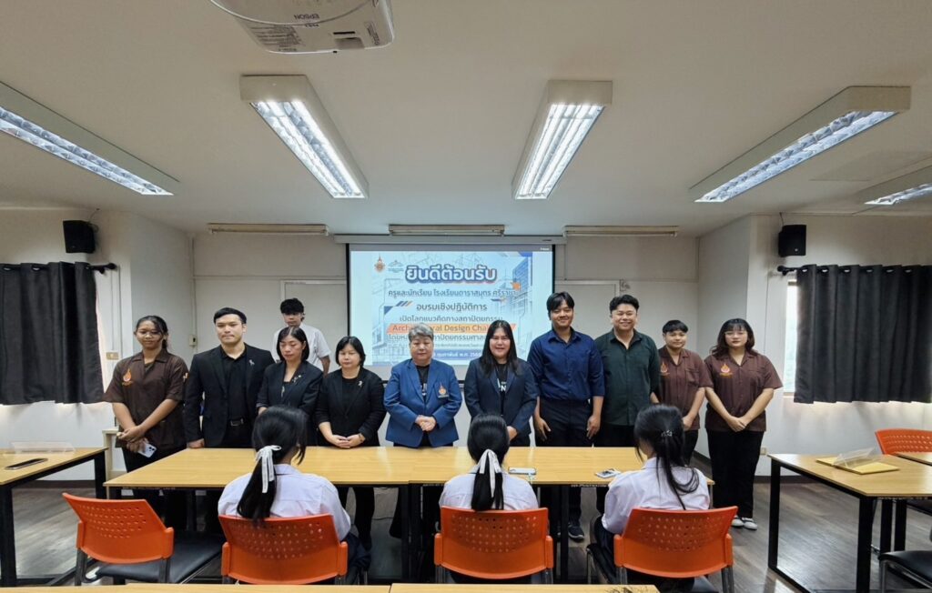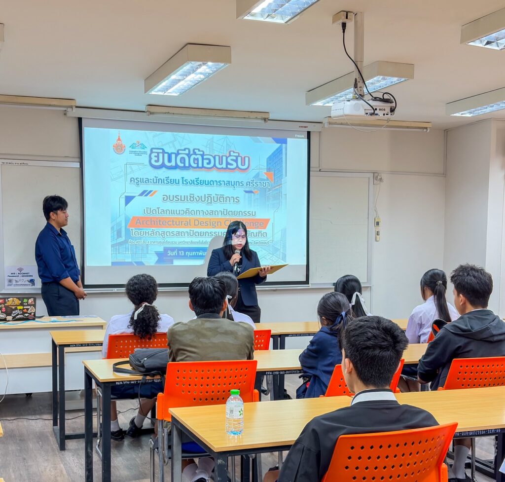 วันศุกร์ที่ 13 กุมภาพันธ์ 2569 นางสาวกัลยาณี มิ่งเจริญพร รองผู้อำนวยการสถาบันนวัตกรรมการศึกษาและการเรียนรู้ตลอดชีวิต ผศ.ดร.ศศิธร ศรีเฟื่องฟุ้ง พร้อมด้วย คณาจารย์ บุคลากรและนักศึกษา ให้การต้อนรับคณะครูและนักเรียนจากโรงเรียนดาราสมุทร ศรีราชา ในโอกาสเข้าร่วมโครงการบริการวิชาการเชิงปฏิบัติการ “เปิดโลกแนวคิดทางสถาปัตยกรรม – Architectural Design Challenge” ณ ห้อง 407 ชั้น 4 อาคารศูนย์เรียนรวม มหาวิทยาลัยเทคโนโลยีราชมงคลตะวันออก เขตพื้นที่บางพระ จังหวัดชลบุรี โครงการนี้เป็นการบริการวิชาการโดยสาขาวิชาสถาปัตยกรรมศาสตร์ กิจกรรมไฮไลท์ภายในงานประกอบด้วย บรรยายร่วมกับ Work shop ในหัวข้อ